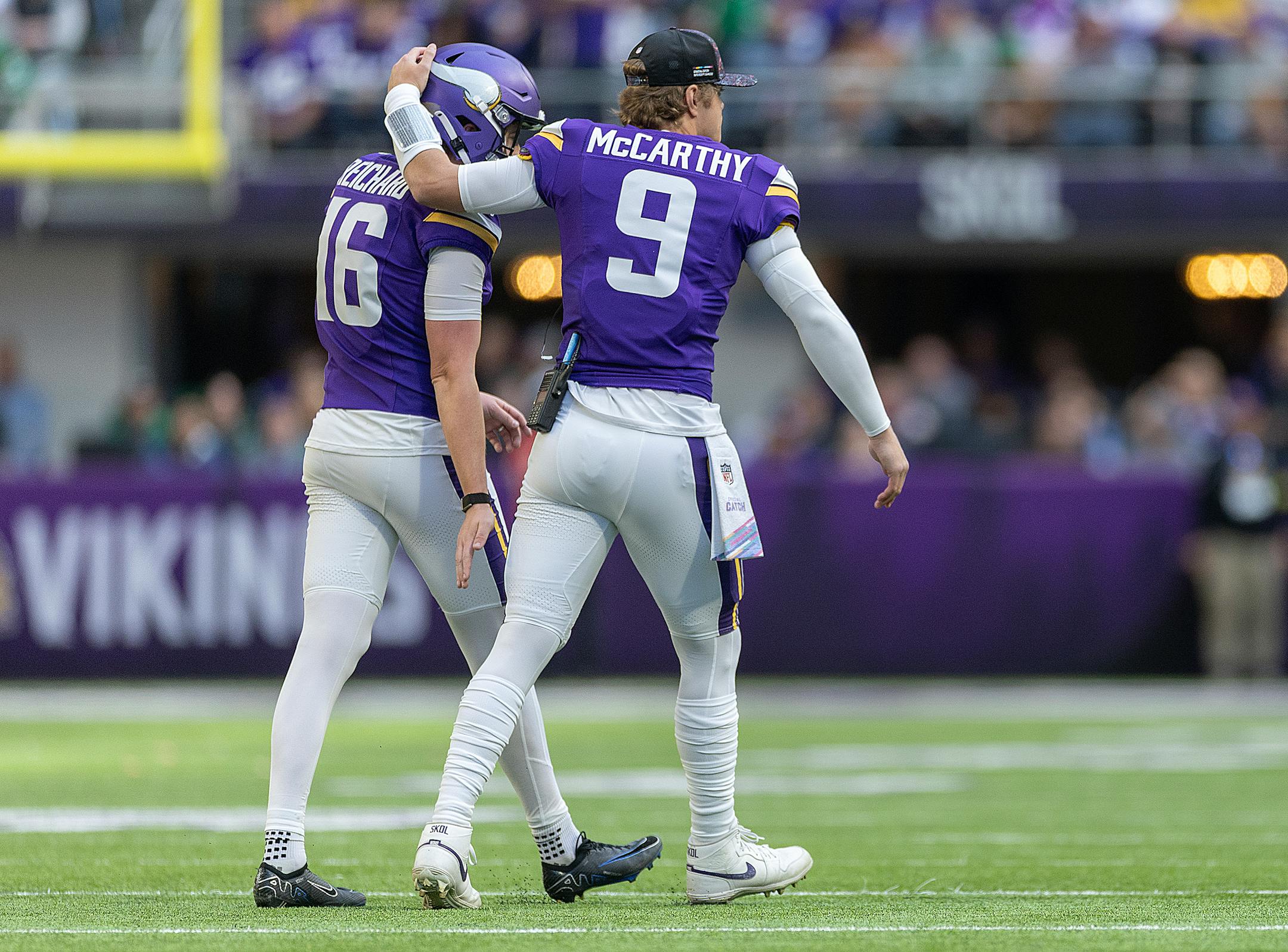Vikings quarterback J.J. McCarthy celebrates a field goal with kicker Will Reichard during the fourth quarter Sunday against the Eagles, when McCarthy was the emergency No. 3 QB. (Elizabeth Flores/The Minnesota Star Tribune)