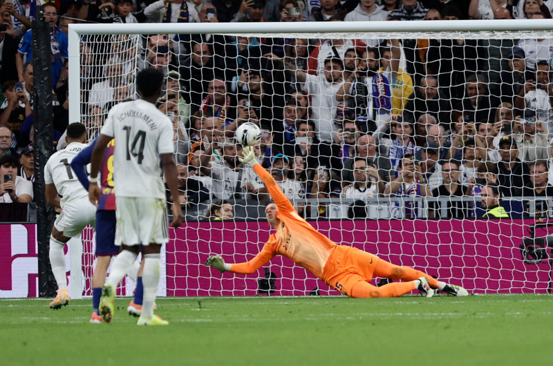 El delantero del Real Madrid Kylian Mbappé, tras lanzar el penalti parado por el portero del Barcelona Wojciech Szczesny, durante el partido de la décima jornada de LaLiga EA Sports, que Real Madrid y FC Barcelona disputaron este domingo en el estadio Santiago Bernabéu. / EFE