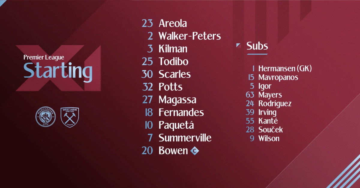 West Ham’s ‘defensive minded’ coach has not gone full-on park the bus against Manchester City, against many of the predictions that the Hammers would start with a Potter-esque 5-3-2 formation. His squad includes a sole attacker in Callum Wilson, of course, now that we hear Niclas Fullkrug is 99% out of the door en route to a new sick bed in Italy.