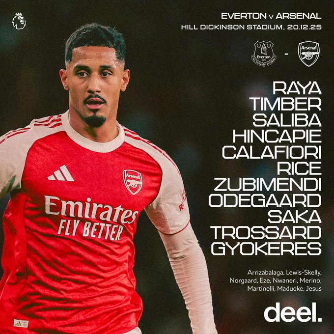 Arsenal travel to the Hill Dickinson Stadium this evening to take on Everton and regain top spot in the Premier League. This is the Gunners’ starting eleven.