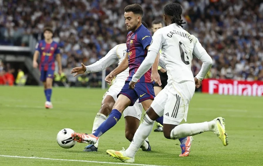 El centrocampista del Real Madrid Eduardo Camavinga y el defensa del Barcelona Eric García, durante el partido de la décima jornada de LaLiga EA Sports, en el estadio Santiago Bernabéu. EFE/Chema Moya