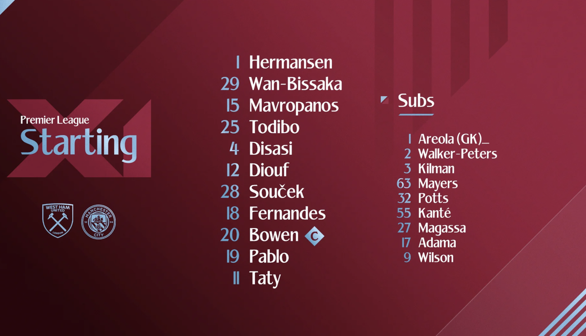 _**Hermansen | Disasi, Todibo, Mavropanos | Wan Bissaka, Soucek, Fernandes, Diouf | Pablo, Bowen, Castellanos**_