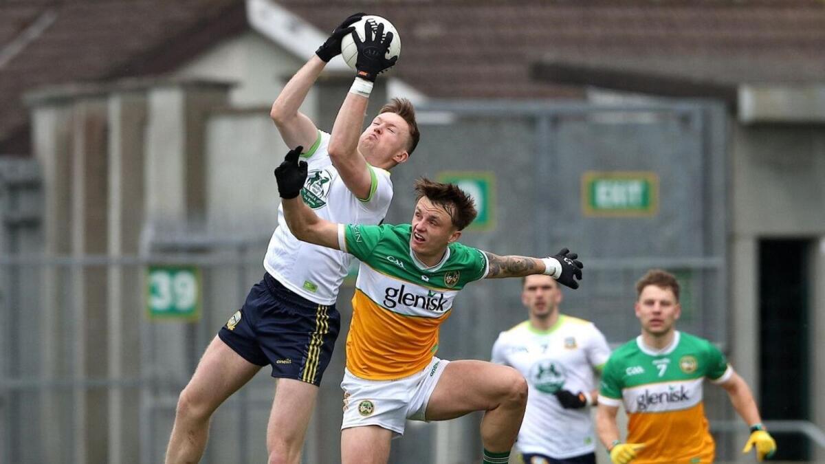 Cian McBride wins possession for Meath ahead of Offaly's Jack McEvoy during Sunday's Division 2 game in Tullamore. Photo: David Mullen (www.cyberimages.net)