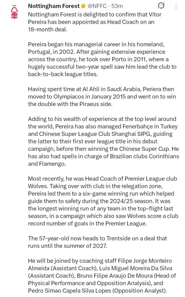 “Nottingham Forest is delighted to confirm that Vítor Pereira has been appointed as Head Coach on an 18-month deal.