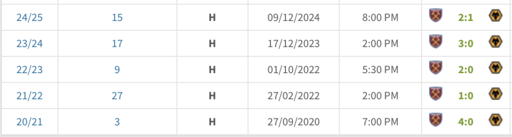 West Ham v Wolves at Home – last 5 season (transfermarkt.com)