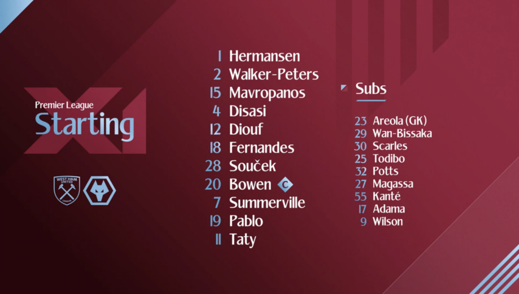 Hermansen | Walker Peters, Mavropanos, Disasi, Diouf | Soucek, Fernandes, | Bowen, Castellanos, Felipe, Summerville